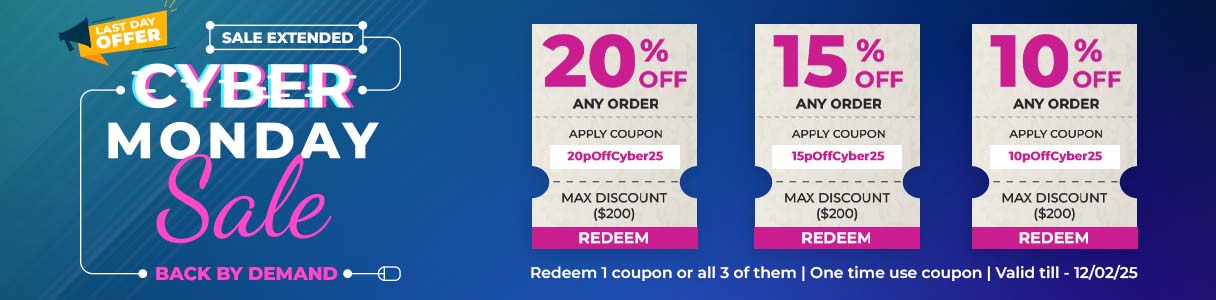 Apply coupon code: 20pOffCyber25 to get Cyber Monday Sale - 20% off any order (upto $200 max)
