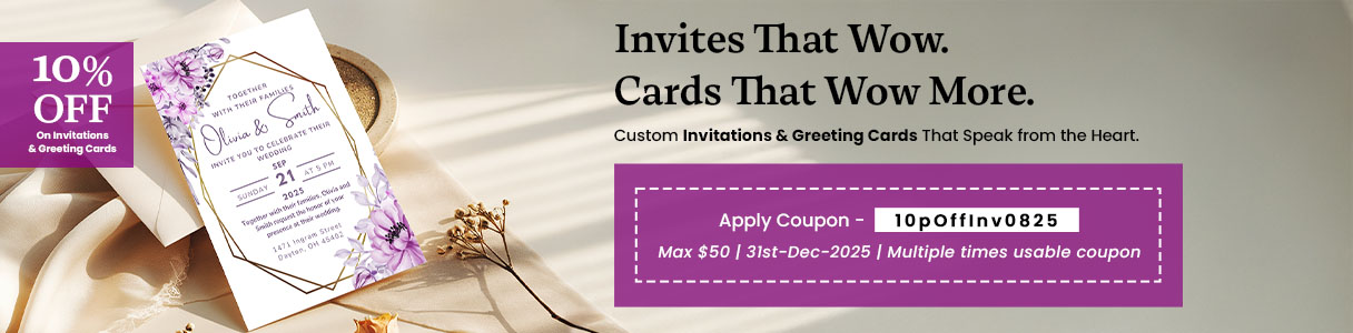 Apply coupon code: 10pOffInv0825 to get 10% Off on Invitations & Greeting Cards (max $50)