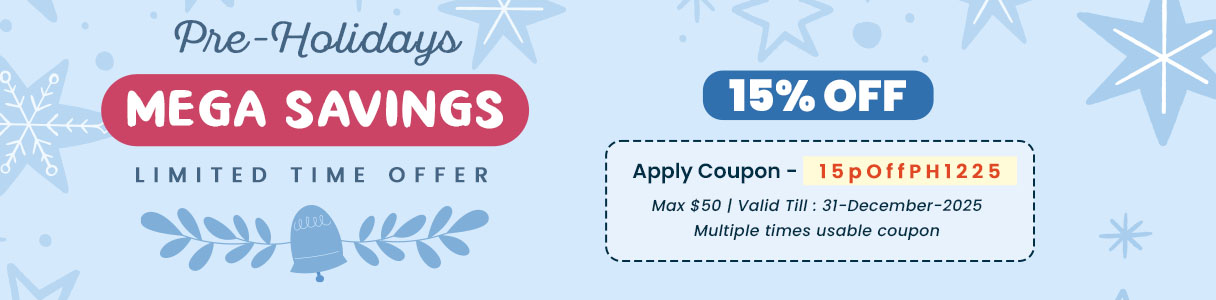 Pre-holidays Mega Savings - 15% off Any Order (upto $50 max)